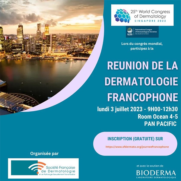 Ne manquez pas la réunion de la dermatologie francophone en préambule du Congrès Mondial de Dermatologie le lundi 3 juillet 2023 ! La participation est gratuite. Adresse : Pan Pacific Singapore - Room Ocean 4-5 - 7 Raffles Blvd, Singapore 039595