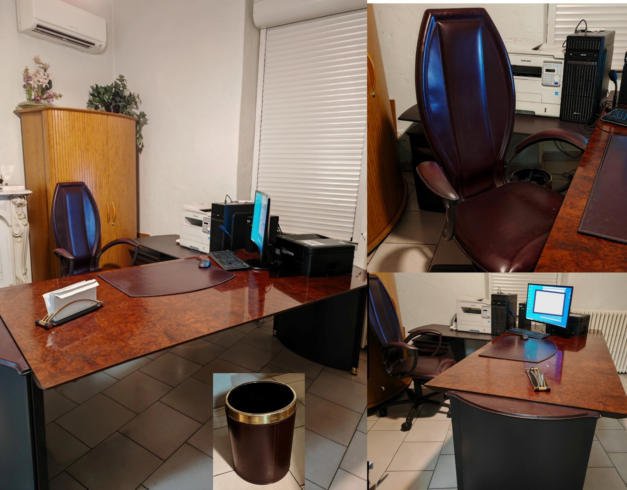 Magnifique bureau en bois de loupe et parements cuir avec chaise assortie et accessoires assortis (sous-main, porte-lettres et poubelle) 1 000 €
