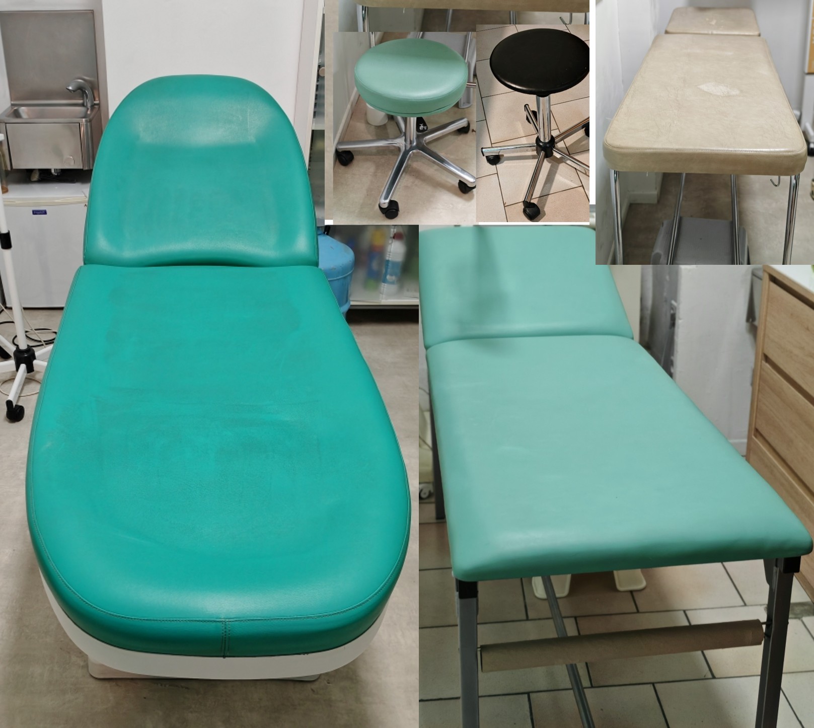 Cause retraite DIVANS MEDICAUX ELECTRIQUE et FIXES Lot de 3 Divans médicaux et 2 tabourets 1200 € possibilité d'acheter séparément 1 divan électrique vert très bon état avec tabouret assorti: 1000 € l'ensemble 1 divan fixe très bon état vert 250 € 1 divan fixe état correct beige (altération superficielle de la sellerie) 50 € 1 tabouret médical noir 20€